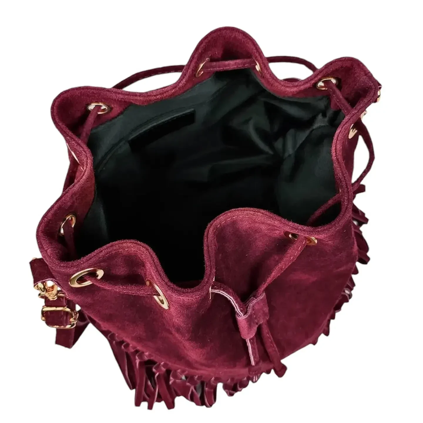 Dit Italiaanse franjetasje is gemaakt van suède. De voering is van polyester.