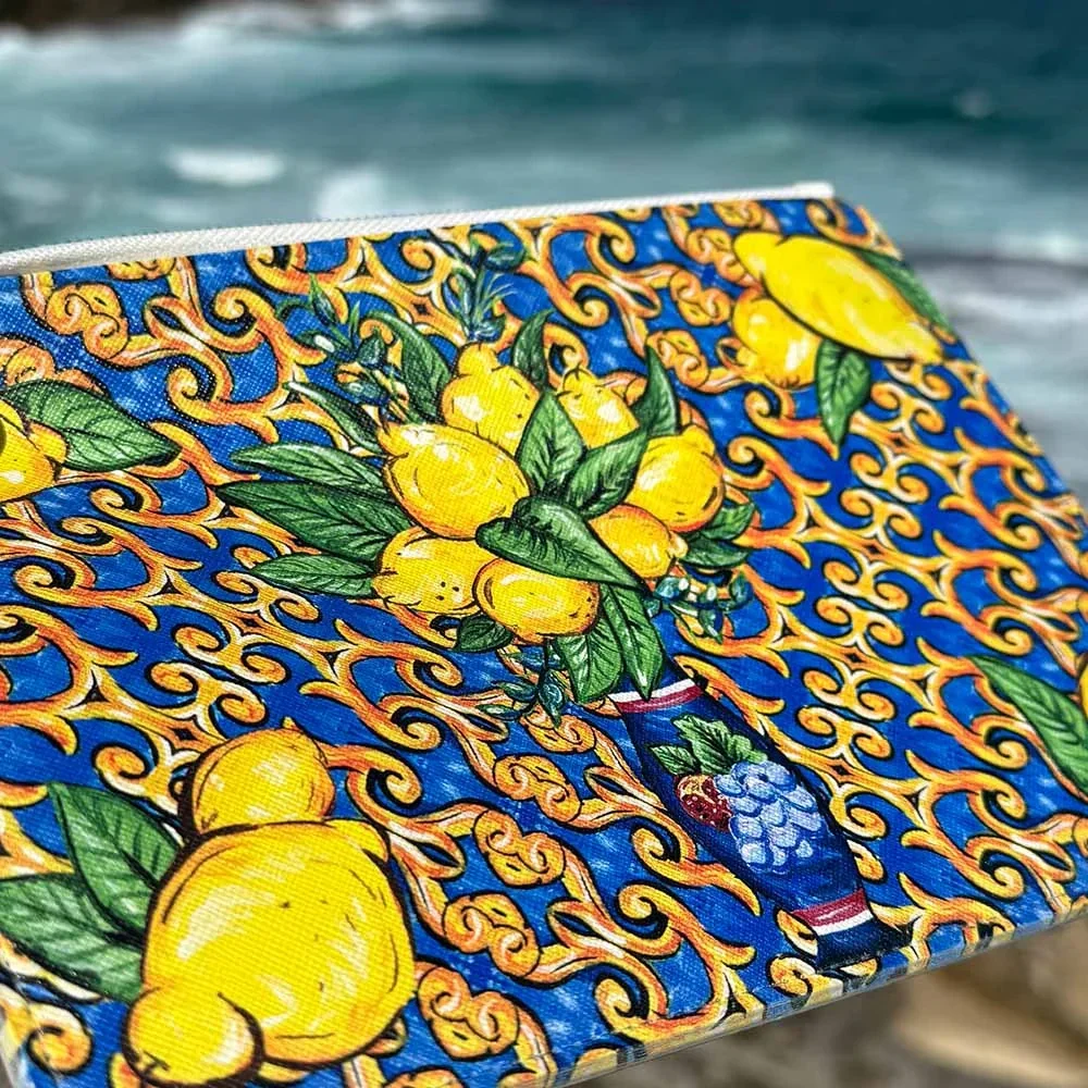 De POSITANO clutch is een heerlijk zomers tasje dat je altijd bij de hand moet hebben, zeker op vakantie! Handgeschilderd in Italië, geïnspireerd op de Majolica tegels in oceaanblauw en met goudgele citroenen van de Amalfikust.